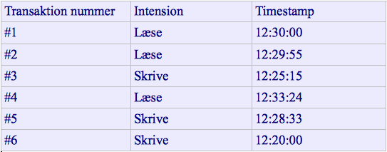 Her har vi en liste af nogle transaktioner der er blevet kørt samtidig, og timestampet der er tilknyttet til hver transaktion er i vores eksempel skrevet som en tid, da vi så ved hvilken tid der er nyest, og dette er nemmere at forholde os til. Når man snakker om timestamping, har man to forskellige intentioner, nemlig enten at læse eller at skrive. Hver intention har deres egen 'log', hvilket betyder at de har to forskellige timestamp 'saving points'. Lad os prøve at gå ind i eksemplet, for at se hvad det er der virkelig sker.